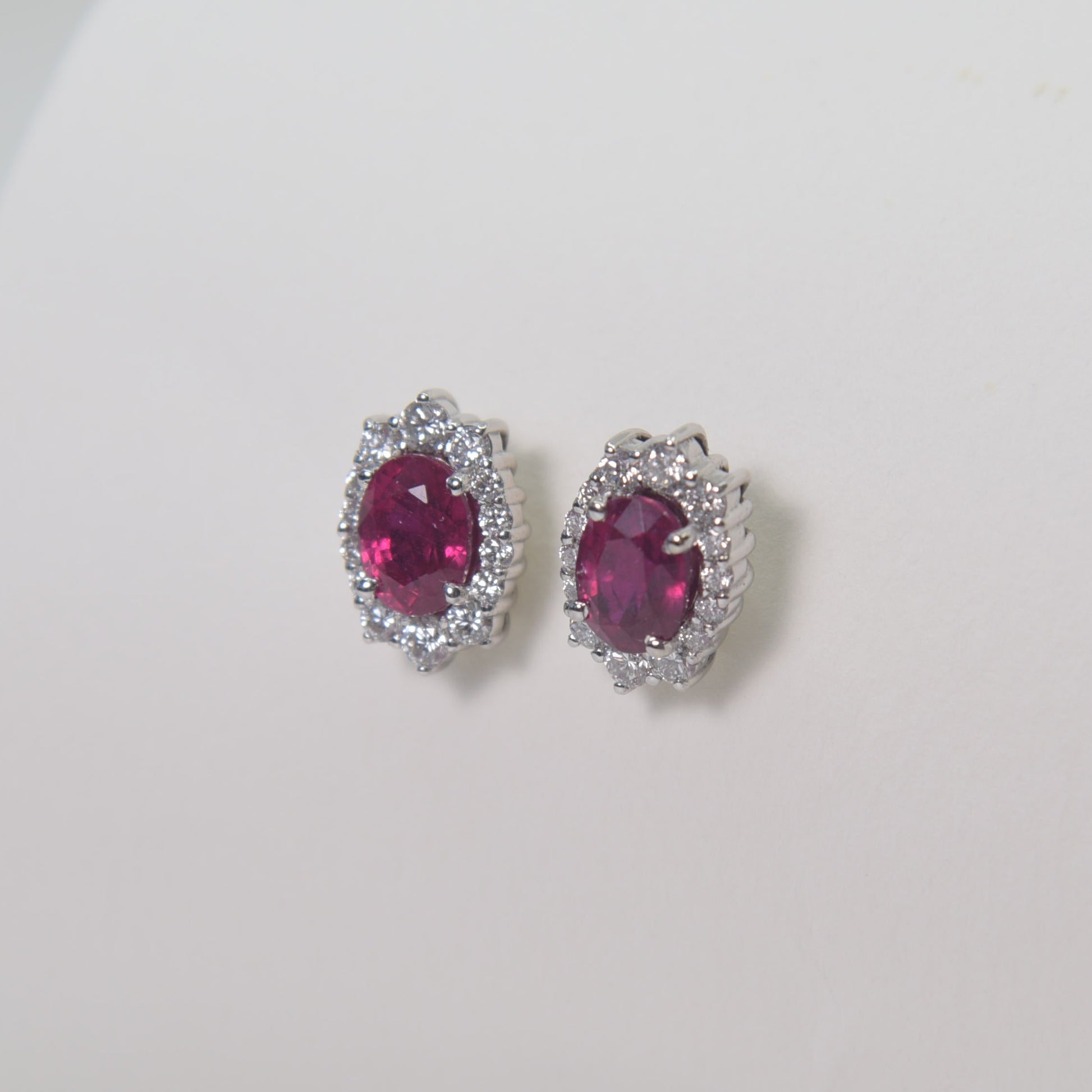 Par de rubíes de 4.06 ct en total con halo de 0.74 ct de diamante con degradado en tamaños en la parte inferior y superior.
